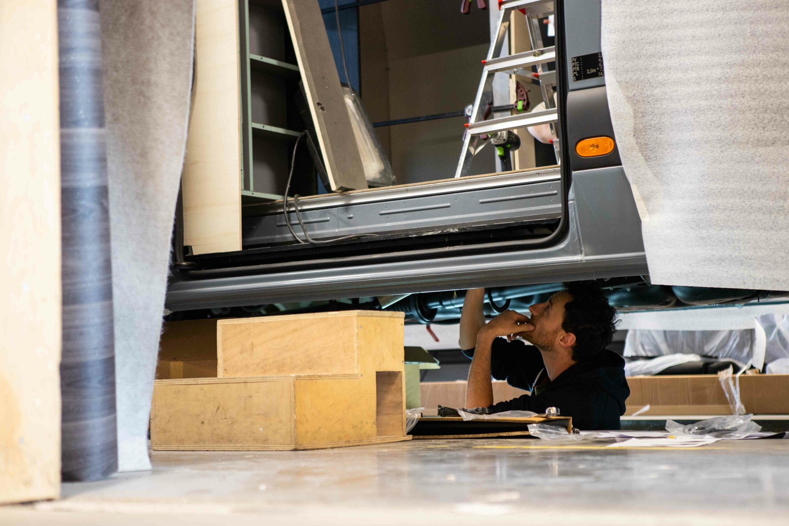 Nos ateliers mécaniques permettent l’installation de tous les accessoires extérieurs (marchepieds, galeries, stores, suspensions, pneus, etc.), mais aussi les interventions sous châssis grâce à nos fosses intégrées : pose de cuves d’eaux, protection, circuits, renforcements…